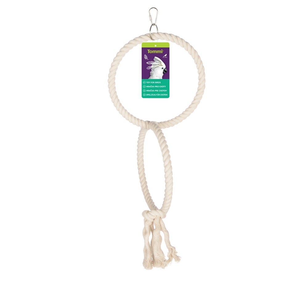 Bavlněný kruh, 2 oka pro velké exotyMateriál : bavlněné lano, kovDélka : 60 cm Vnitřní průměr : 18 cm / 1 oko przeczytaj całość