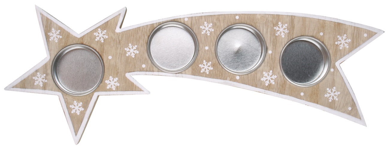Dřevěný adventní svícenAdventní svícen s motivem komety krásně dotvoří váš vánoční stůl.Velmi pěkné zpracování a moderní design, který se hodí téměř do každého interiéru.Svícen je uzpůsobený na čajové svíčky. przeczytaj całość