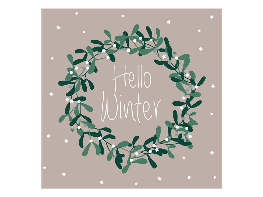 Papírový vánoční ubrousek. Ubrousek je kvalitní z třívrstvého papíru s motivem věnce ze jmelí a nápisem „Hello Winter“. Vytvořeni decentní vánoční atmosféry stojí na maličkostech. I taková drobnost, jako vánoční ubrousky změní ráz vašeho stolování.