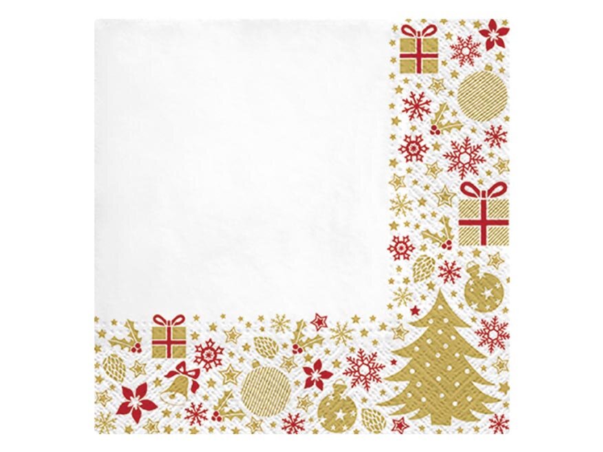 Papírový vánoční ubrousek s motivem vánočních symbolů, jako jsou dárky, stromečky, vločky a ozdoby. Tyto prvky jsou uspořádány kolem tří rohů, zatímco zbytek ubrousku zůstává bílý, což vytváří elegantní a čistý vzhled. Je vyroben z velmi kvalitního třívrstvého papíru. Tento ubrousek můžete využít...