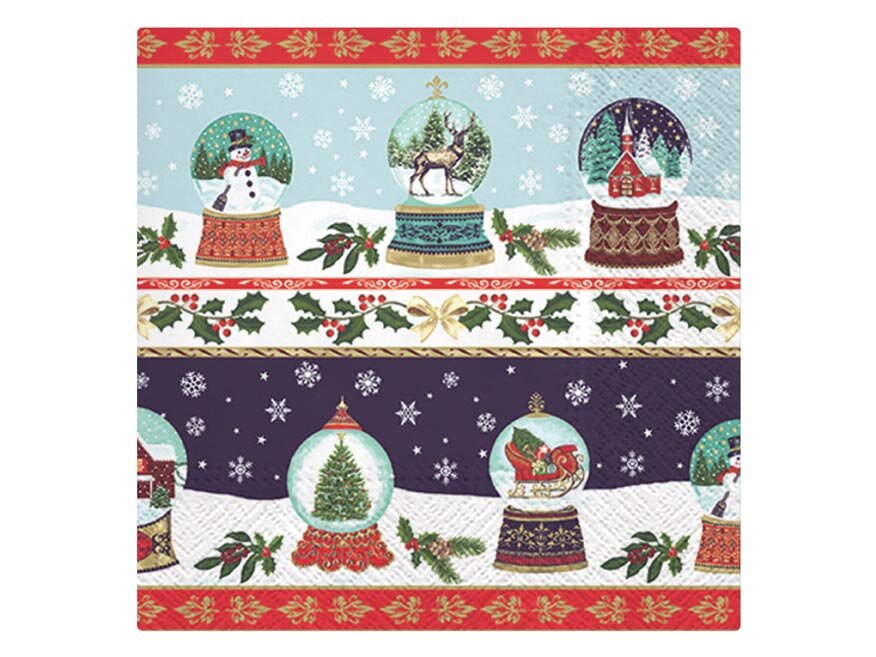 Papírový vánoční ubrousek s motivem sněhových koulí s různými zimními scénami. Je vyroben z velmi kvalitního třívrstvého papíru. Tento ubrousek je skvělý pro vánoční slavnosti, přičemž jeho detailní a barevný design přispívá k vytvoření veselé a sváteční atmosféry na každém stole.