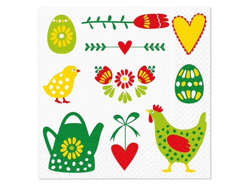 Papírový velikonoční ubrousek. Krásné velikonoční ubrousky s obrázky slepičky, kuřátka, kraslic a konve dodají prostřenému stolu nádech přicházejícího jara a vykouzlí příjemnou atmosféru u slavnostního oběda nebo večeře. Ubrousek je kvalitní z třívrstvého papíru. Vhodný i na ubrouskovou techniku...