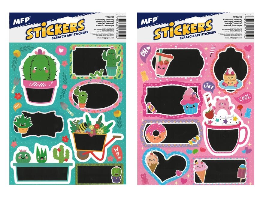 Škrabací samolepící jmenovky. Každá samolepka má jiný tvar a obrázek. Díky netradičnímu vzhledu samolepek dostane váš sešit, diář či blok originální look. Popisek bude po vyškrabání barevný.