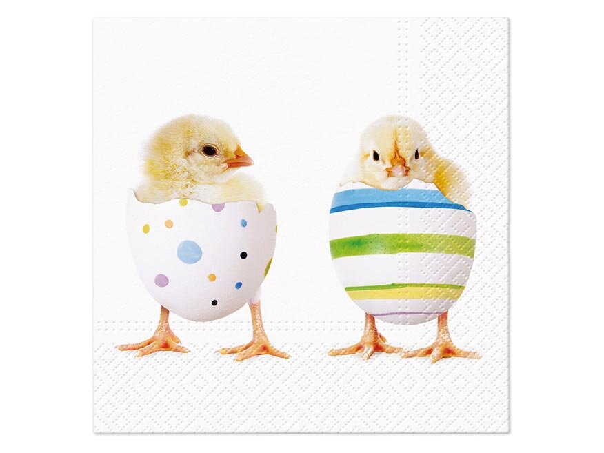 Papírový velikonoční ubrousek. Krásné velikonoční ubrousky s obrázky kuřátek v barevných skořápkách dodají prostřenému stolu nádech přicházejícího jara a vykouzlí příjemnou atmosféru u slavnostního oběda nebo večeře. Ubrousek je kvalitní z třívrstvého papíru. Vhodný i na ubrouskovou techniku a různé dekorace.