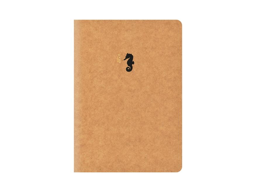 Zeszyt szkolny w linię w formacie A5, w brązowym kolorze, z motywem konika morskiego, w oryginalnych okładkach z papieru kraft. Strony mają marginesy o szerokości 1,5 cm.