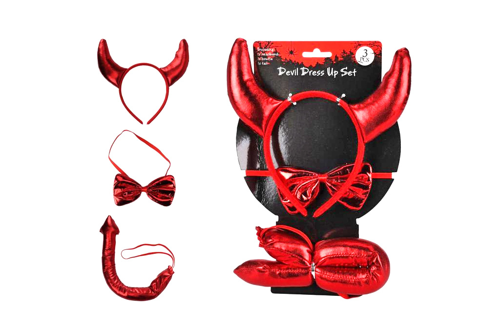 Vlastnosti:Ideální na halloweenské oslavy i další tematické akce.Obsahuje rohy, ocas a mašli v červené barvě.Snadno se obléká a je opakovaně použitelný.Vhodný pro děti i dospělé, univerzální velikost.Lze kombinovat s různými outfity pro vlastní stylizaci.Parametry:V balení: rohy na čelence, ocas...