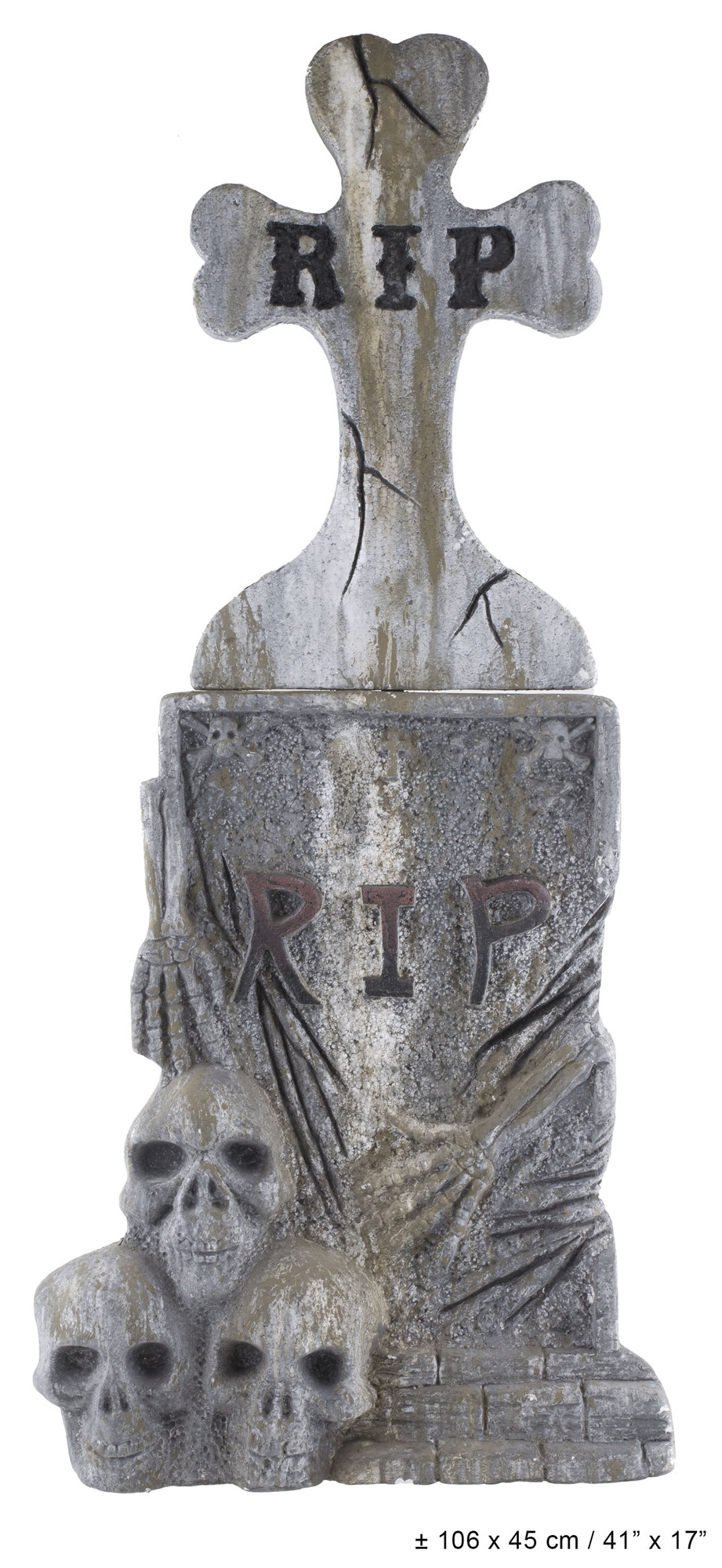 Klasyczna dekoracja na Halloween. Nagrobek z motywem krzyża i czaszek u podstawy kamienia. Nie brakuje też napisu RIP. Spoczywaj w pokoju!Materiał: PolistyrenKolor: szaryWymiary: 106 x 45 x 10 cmWaga: 0,3 kg przeczytaj całość