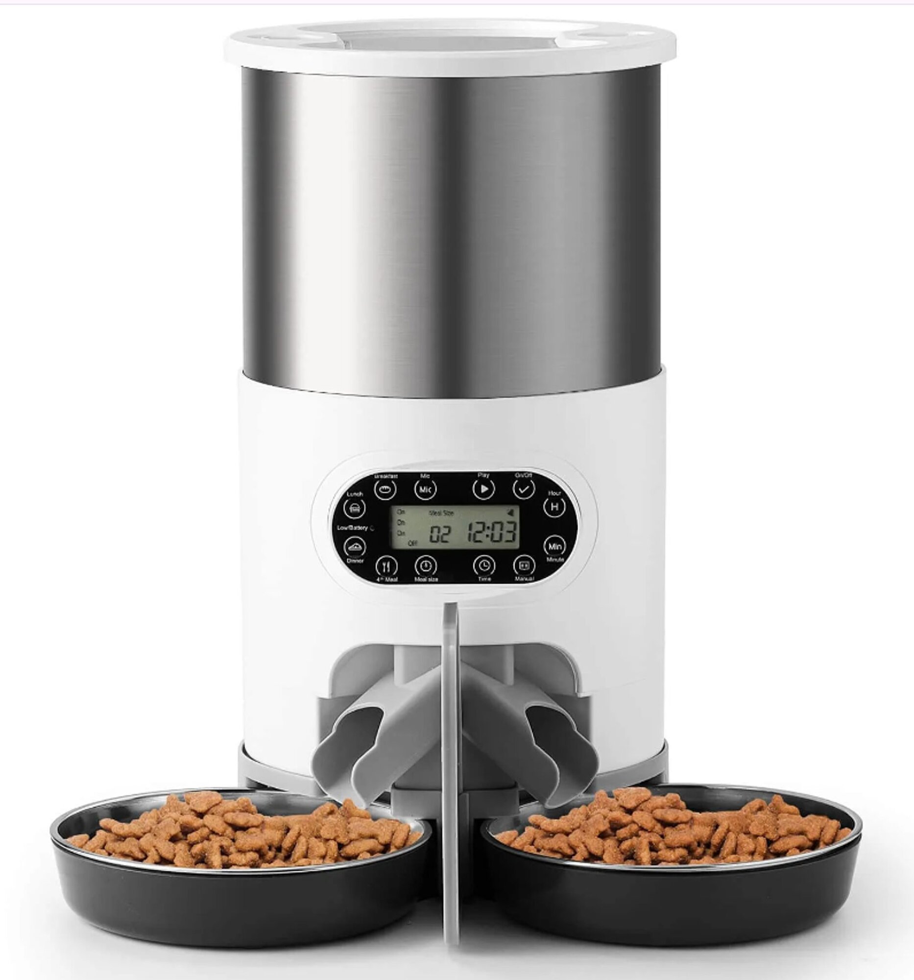 Automatyczne karmidło o pojemności 4,5 litra to idealne rozwiązanie dla osób posiadających więcej niż jedno zwierzę domowe. Ten podwójny inteligentny podajnik z automatycznym dozowaniem pozwala karmić dwa zwierzęta jednocześnie i zapewnia, że ich potrzeby żywieniowe będą zaspokojone także podczas Twojej nieobecności. Dzięki przemyślanej konstrukcji koty nie będą miały dostępu do karmy przeznaczonej dla drugiego zwierzaka. Do podajnika należy wsypywać suchą karmę o wielkości do 12 mm. Urządzenie wyposażone jest w czytelny wyświetlacz oraz możliwość odtworzenia nagranego głosu. Ponadto jest wyposażone w podwójne źródło zasilania, dzięki czemu Twój pupil nie zostanie pozbawiony jedzenia nawet przy awarii prądu.
