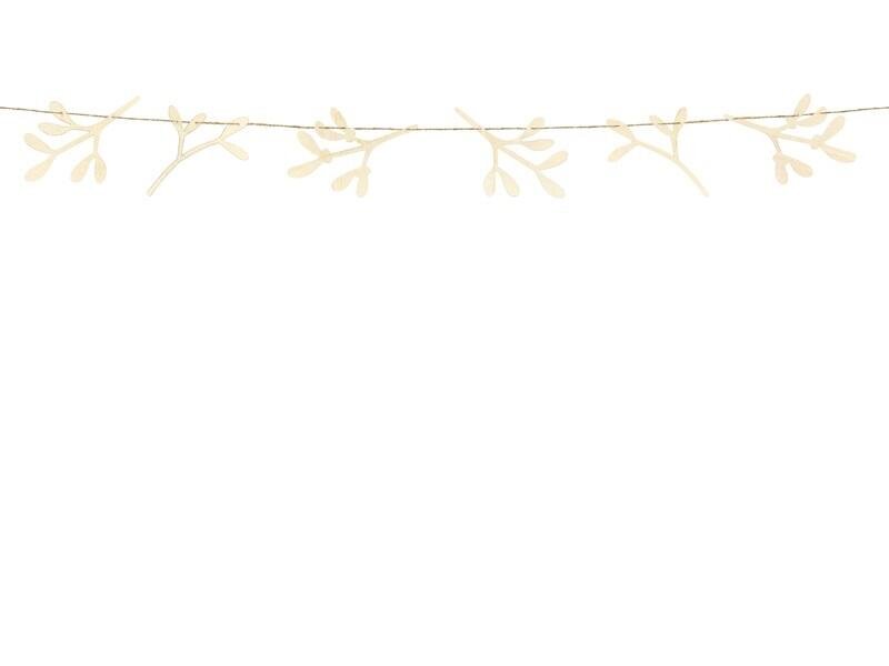 Girlanda Jemioła wykonana z drewna, zestaw zawiera 3 wzory gałązek, po 2 z każdego wzoru oraz ok. 2 m lnianego sznurka, wymiary po złożeniu: długość ok. 127 cm, wysokość ok. 10,5 cm. Produkt do samodzielengo złożenia. przeczytaj całość