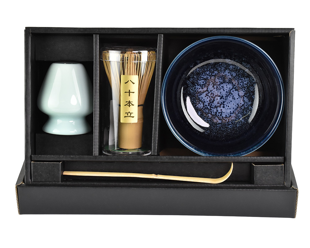 Zestaw składa się z kamionkowej miski, bambusowej łyżeczki do matchy Chashaku, bambusowej miotełki Chasen oraz ceramicznego stojaka na Chasen. Zestaw nadaje się do przygotowania matchy sposobem Usucha (delikatna, lekka herbata) oraz sposobem Koicha (gęsta, mocna herbata). Parametry: Miska: średnica - 13 cm, wysokość - 7 cm Łyżeczka: długość - 18 cm Chasen: wysokość - 10,5 cm, górna średnica - 6 cm Stojak: wysokość - 7,5 cm