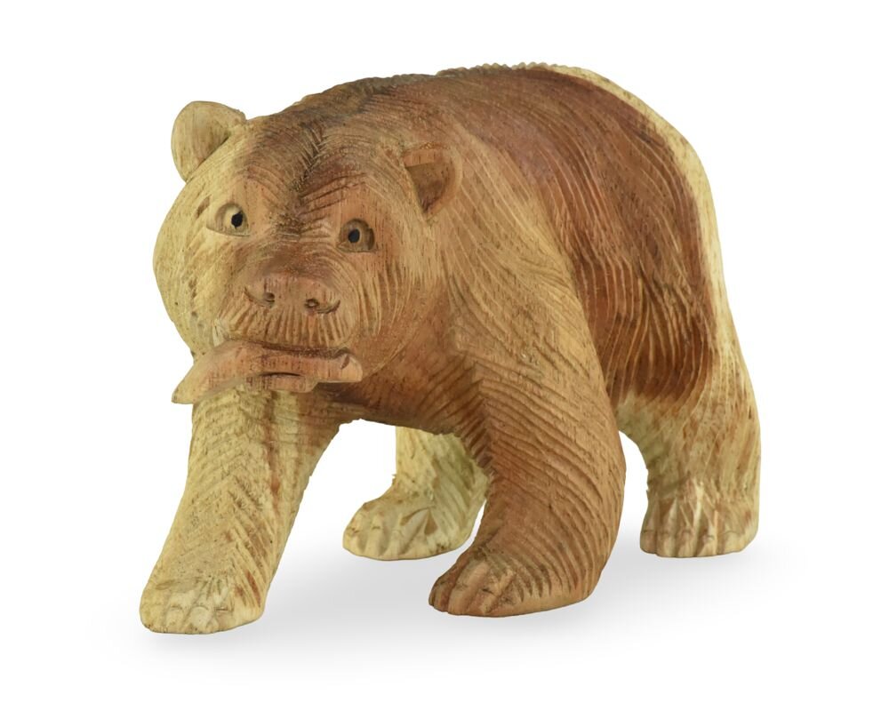 Dřevěná soška Medvěd s rybou 11 cm - dvoubarevný - II. jakost