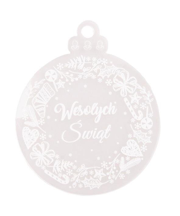 Bombka wykonana z przezroczystej plexi z białym nadrukiem. Średnica 8cm, wysokość całkowita 10cm. W opakowaniu 1szt przeczytaj całość