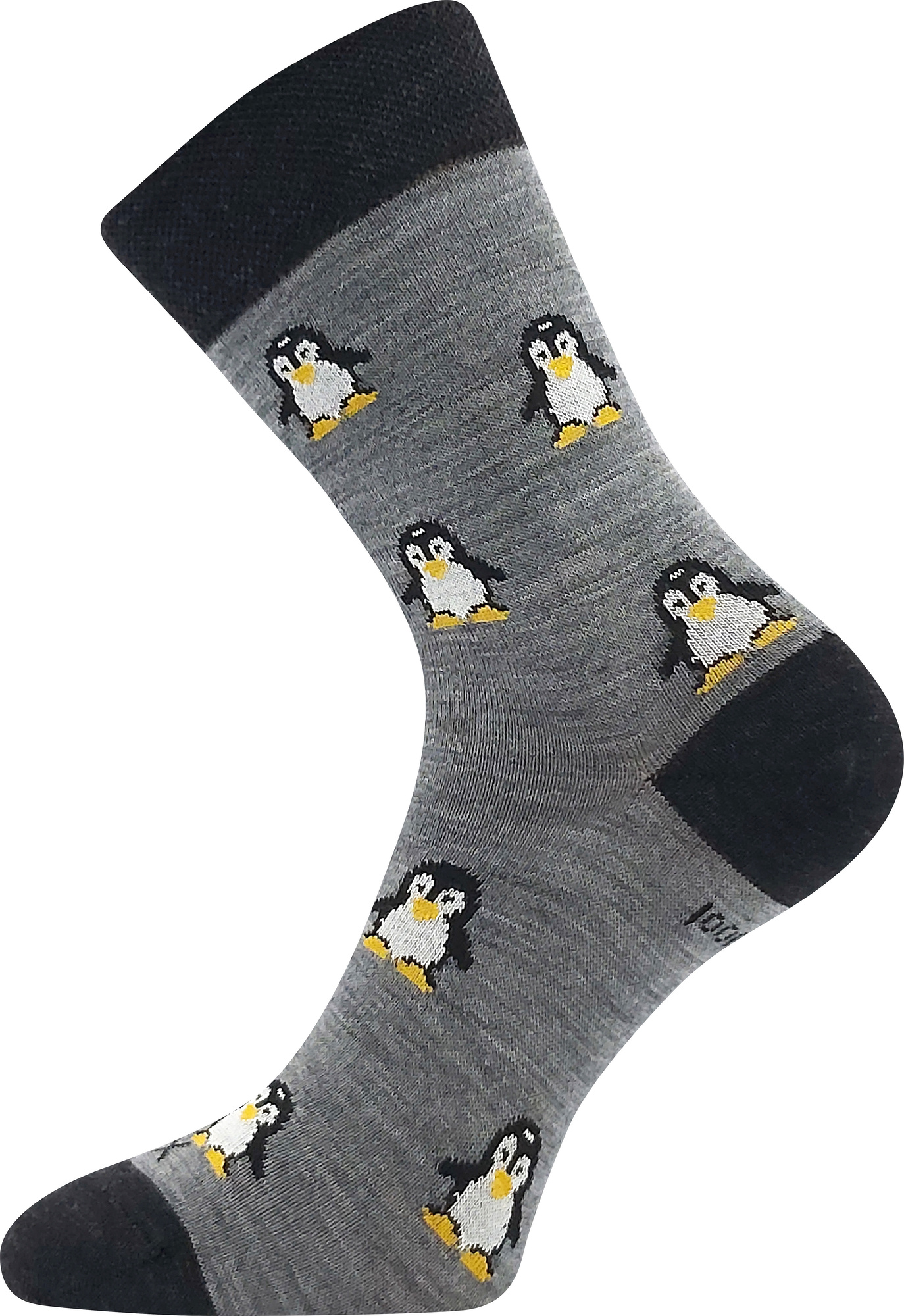Dámské vlněné merino ponožky VoXX® SNĚŽENKA s vtipnými obrázky tučňáků jsou roztomilé na první pohled. Zároveň jsou odolné proti opotřebení, mají vyztuženou špičku a patu. Teplé slabé ponožky mají špici uzavřenou řetízkováním, takže nikde netlačí. Materiály merino vlna a silproX® s ionty stříbra...