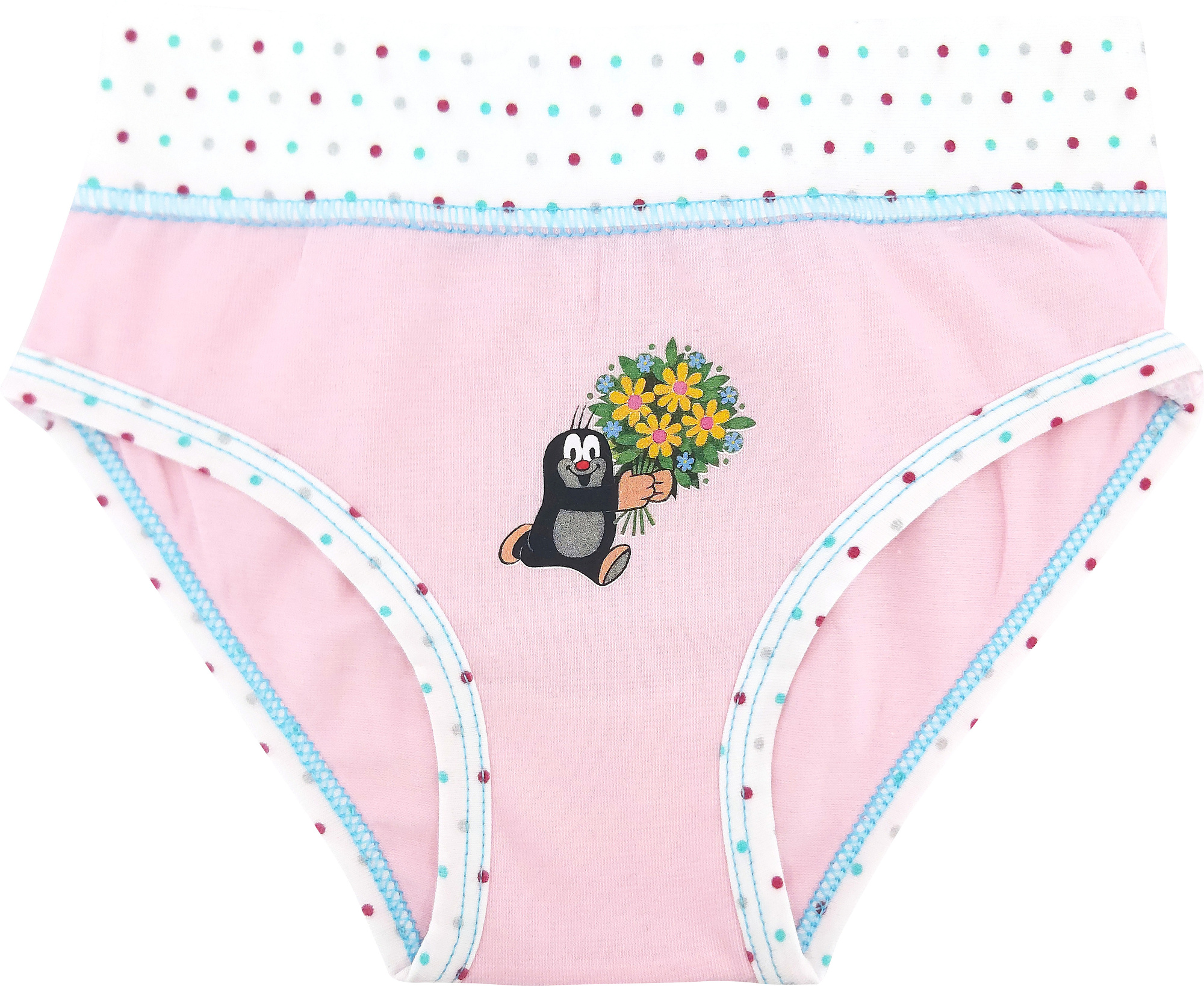 Dívčí kalhotky s Krtečkem KR 006 z kolekce Boma® pro malé slečny. Elastický bavlněný úplet je pružný, vyšší podíl bavlny zaručuje pohodlné nošení během celého dne. Lemy nohaviček a v pase jsou z puntíkatého úpletu bez škrtících gumiček, sešité plochými švy pro maximální pohodlí. Dětské kalhotky mají potisk s obrázkem oblíbeného Krtka, na každodenní nošení jak dělané.
