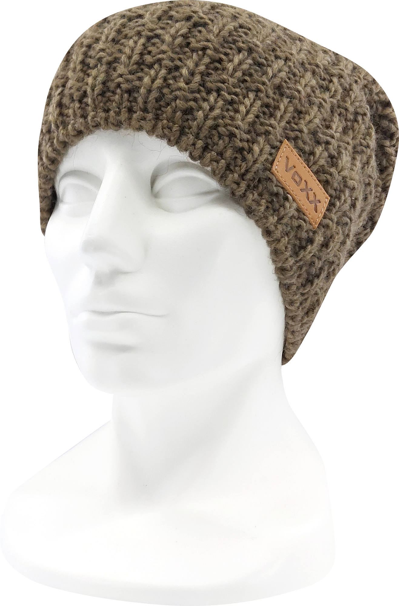 dámská pletená čepice s podílem vlny merino, zdobená koženou etiketou VoXX®, vnitřní strana mikrofleece przeczytaj całość