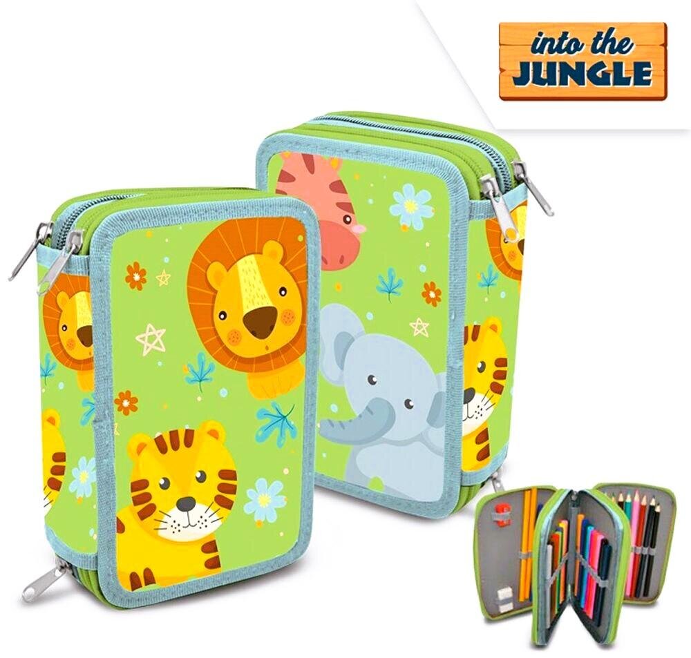 Trzypoziomowy piórnik z wyposażeniem z motywem Jungle. Wymiary: 20 x 12 x 6 cm.Materiał: poliester.Kolorystyka: zielono-pomarańczowa.W zestawie wyposażenie wewnętrzne, zgodnie z ilustracją.Producent: Euroswan. przeczytaj całość