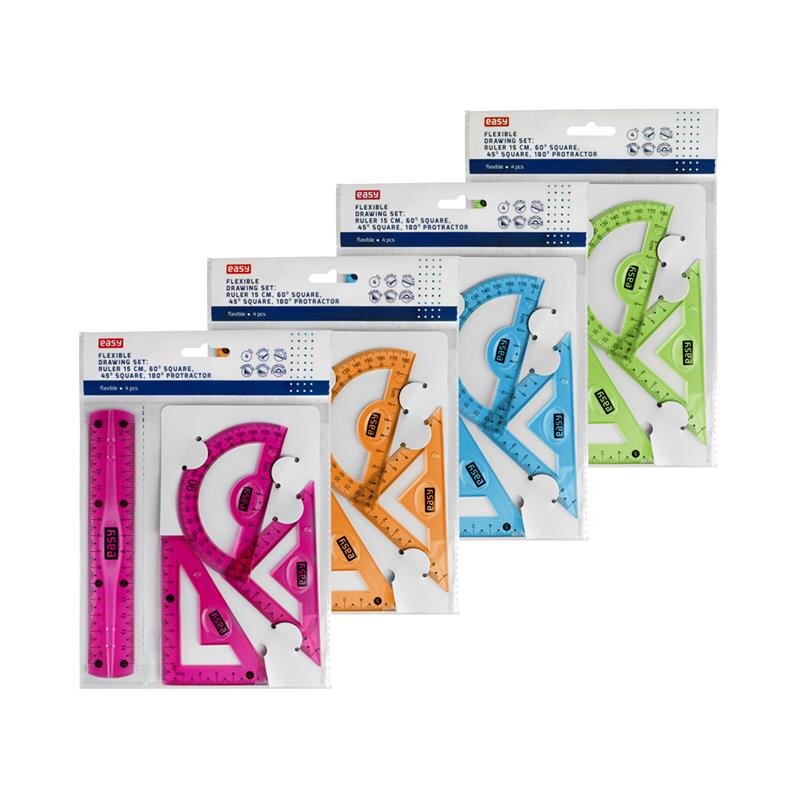 Sada 4 ohebných školních pravítek: pravítko, úhloměr, trojúhelník 45°a 60°- délka pravítka: 15 cmInformace pro velkoodběratele:displej: 12 ks sad pravítekbalení: 12 displejů/kartonmožný prodej po 1 displejiEAN samostatného výrobku: 5902693238379 zelená5902693238386 růžová5902693238393... przeczytaj całość