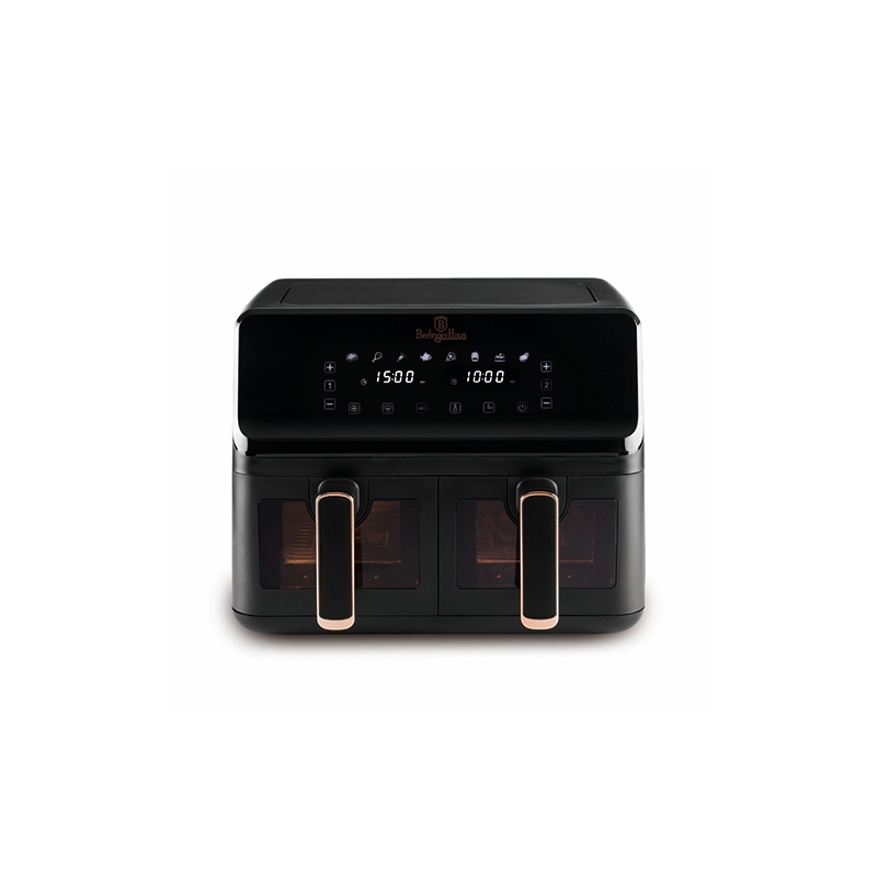 - Napájení: 220-240V ~ 50Hz 2700W - Regulace teploty: 80-200° C - XXXL VELIKOST: Kapacita: 8,2L=4,1L+4,1L- Nepřilnavý zásobník na olej a koš na potraviny - lze mýt v myčce nádobí- DIGITÁLNÍ ovládání- Barva: černo růžovo-zlatá black rose- ochrana proti přehřátí- LED displej s dotykovou obrazovkou- Průzorová okénka- Protiskluzové nožičky- Časovač až na 60 min.- Zdravý způsob vaření bez oleje a tuku- Až o 80 % méně tuku