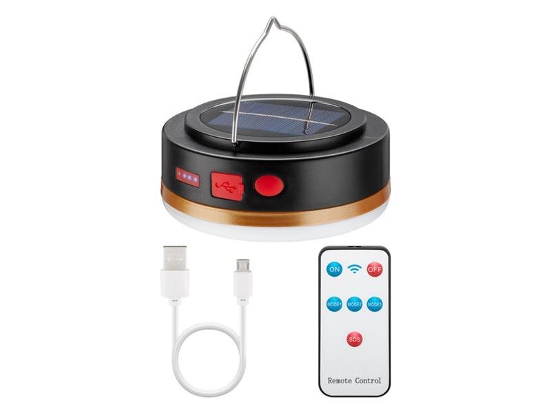 LED solarnа lampa kempingowa z pilotem na podczerwień (IR) Lampa kempingowa z przyciskiem do 5 trybów oświetlenia: 100% światła, 50% światła, efekt stroboskopowy, czerwone światło, sygnał SOS (migające czerwone światło) Pilot z 6 przyciskami: Włącz = 100%, Wyłącz, tryb 1 = 75%, tryb 2 = 50%, tryb 3 = stroboskop, SOS (czerwone światło), zasięg ok. 5 m, w zestawie 1x bateria guzikowa CR2025 Trwale zamontowany akumulator Li-ion 18650 z funkcją powerbanku (3,7 V, 2000 mAh), ładowanie przez USB ok. 4 h = ok. 4 h świecenia Wyjście USB umożliwia ładowanie smartfonów i innych urządzeń z USB-A w sytuacjach awaryjnych Ładowanie przez polikrystaliczny silikonowy panel solarny lub kabel Micro-USB (50 cm), z 4-stopniowym wskaźnikiem stanu naładowania Z 220 lm, zimnym białym światłem (6800 K) i składanym metalowym uchwytem do przenoszenia lub zawieszania na namiocie, drzewie lub plecaku Wykonane z wysokiej jakości materiałów ABS i PP, odporne na warunki atmosferyczne (IP44), oszczędzające miejsce i idealne do kempingu, turystyki, grillowania lub przygotowań awaryjnych