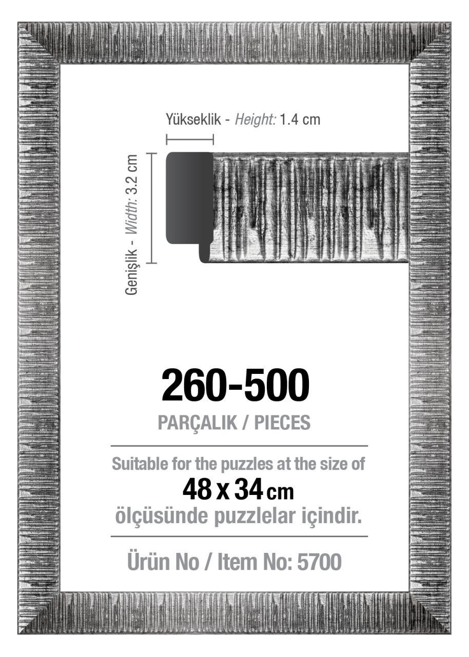 Designerska rama na puzzle bez wypełnienia o szerokości ok. 3 cm. Rama jest przeznaczona dla ART PUZZLE 500 elementów o maksymalnym rozmiarze 48 x 34 cm. Można jej użyć także do puzzli innych marek (o tych samych wymiarach). Balenie zawiera: ramę na puzzle, kartonową podkładkę oraz haczyk do zawieszenia oprawionego puzzla. Instrukcja Najpierw sklej puzzle (klej nie jest częścią zestawu). Do tego celu najbardziej odpowiednie są kleje, które wnikają między elementy, lub folie klejące. Po wyschnięciu kleju umieść sklejone puzzle w ramce, przyłóż kartonową tylną ściankę i zatrzaśnij. Ostrożnie przymocuj haczyk do zawieszenia do dłuższej lub krótszej krawędzi tylnej części ramy i powieś puzzle na ścianie. Uwaga: Zestaw nie zawiera szkła ani innego wypełnienia, aby nie zniekształcić końcowego efektu obrazka z puzzli.