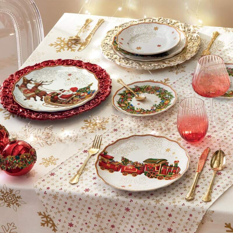 Slavnostní design: Každý talíř má klasické vánoční motivy, jako jsou sáně, vláčky, sobi a hvězdy, které přinášejí nádech radosti a tradice.