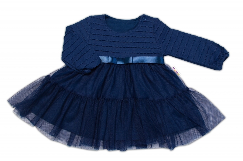 Rozšířený střih a elegantní látka. Dvouvrstvý top; svršek je z mačkaného bavlněného materiálu s hladkou bavlněnou podšívkou. Na straně ramene je zapínání na cvočky, rukávy zakončené volnou gumičkou. Námořnická modrá/granátová bavlněná sukně s našitými tylovými volány. Granátová vsadka s mašlí...