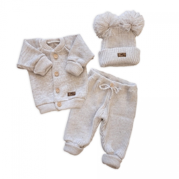 3-dílná pletená souprava na chladné dny.Svetřík má zapínání na knoflíčky. Zaručuje pohodlí a pohodlí při oblékání. Perfektní pro každé roční období. Dlouhé manžety na rukávech umožňují svetříku růst s dítětem. Kalhoty mají velmi elastický pás, díky kterému se kalhoty přizpůsobí každé postavě a...