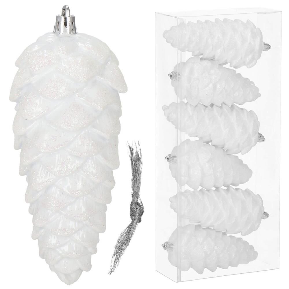 Sada 6 ks bílých ozdob na stromeček s motivem šišky. Výška ozdoby 14 cm, lesklé provedení se třpytkami, poutko na zavěšení, nerozbitný plastový materiál. Ideální k výzdobě stromečku nebo jako vánoční dekorace. Zdarma provázky pro snadné zavěšení. przeczytaj całość