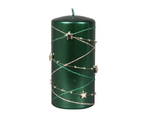 Vánoční svíčka ve tvaru válce je ozdobena glitrovými proužky a hvězdičkami. Doba hoření: 75 hodin. Barva: zelená. Průměr: 7 cm, výška: 14 cm. przeczytaj całość