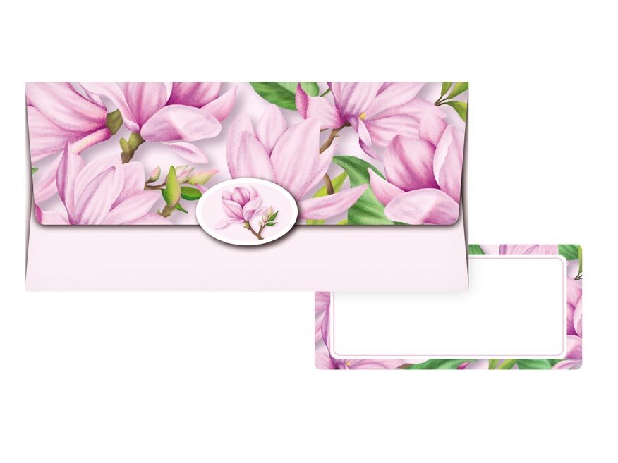 Podaruj pieniądze ze stylem i osobistym akcentem. Ta koperta na pieniądze z delikatnym wzorem kwiatów magnolii w różowym wydaniu przyciąga wzrok i doda Twojemu upominkowi wyjątkowego uroku. Niezależnie od tego, czy to ślub, urodziny czy rocznica - z tą kopertą Twój finansowy prezent będzie oryginalny i niezapomniany.