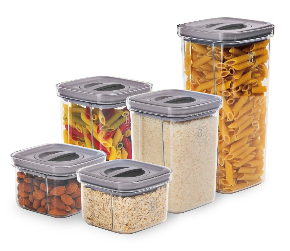 Szczegóły produktu: Zestaw pojemników Taupe Collection 5+5 sztuk jest praktycznym i stylowym rozwiązaniem do przechowywania w kuchni. Plastikowe pojemniki wyposażone są w szczelny system otwierania/zamykania pokrywki, dzięki czemu żywność pozostaje świeża i nie wydostaje się z pojemników. Przezroczyste ścianki z plastiku pozwalają łatwo zobaczyć, co znajduje się w środku, więc nie musisz przeszukiwać szafki czy lodówki. Zestaw zawiera 2 pojemniki o pojemności 460 ml (11,2*11,2*8 cm), 2 pojemniki o pojemności 1100 ml (11,2*11,2*15 cm) oraz 1 pojemnik o pojemności 1500 ml (11,2*11,2*23 cm), dlatego nadaje się do przechowywania żywności o różnych rozmiarach. Kolor zestawu to taupe, co nadaje kuchni nowoczesny i elegancki wygląd.