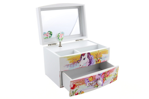 Przeżyj radość z każdej chwili dzięki naszej drewnianej szkatułce na biżuterię z motywem jednorożca. Pozwól sobie lub bliskim oczarować się tym wyjątkowym egzemplarzem, który nie tylko bezpiecznie przechowa Twoje skarby, lecz także rozbrzmi piękną melodią i stworzy czarujący efekt.