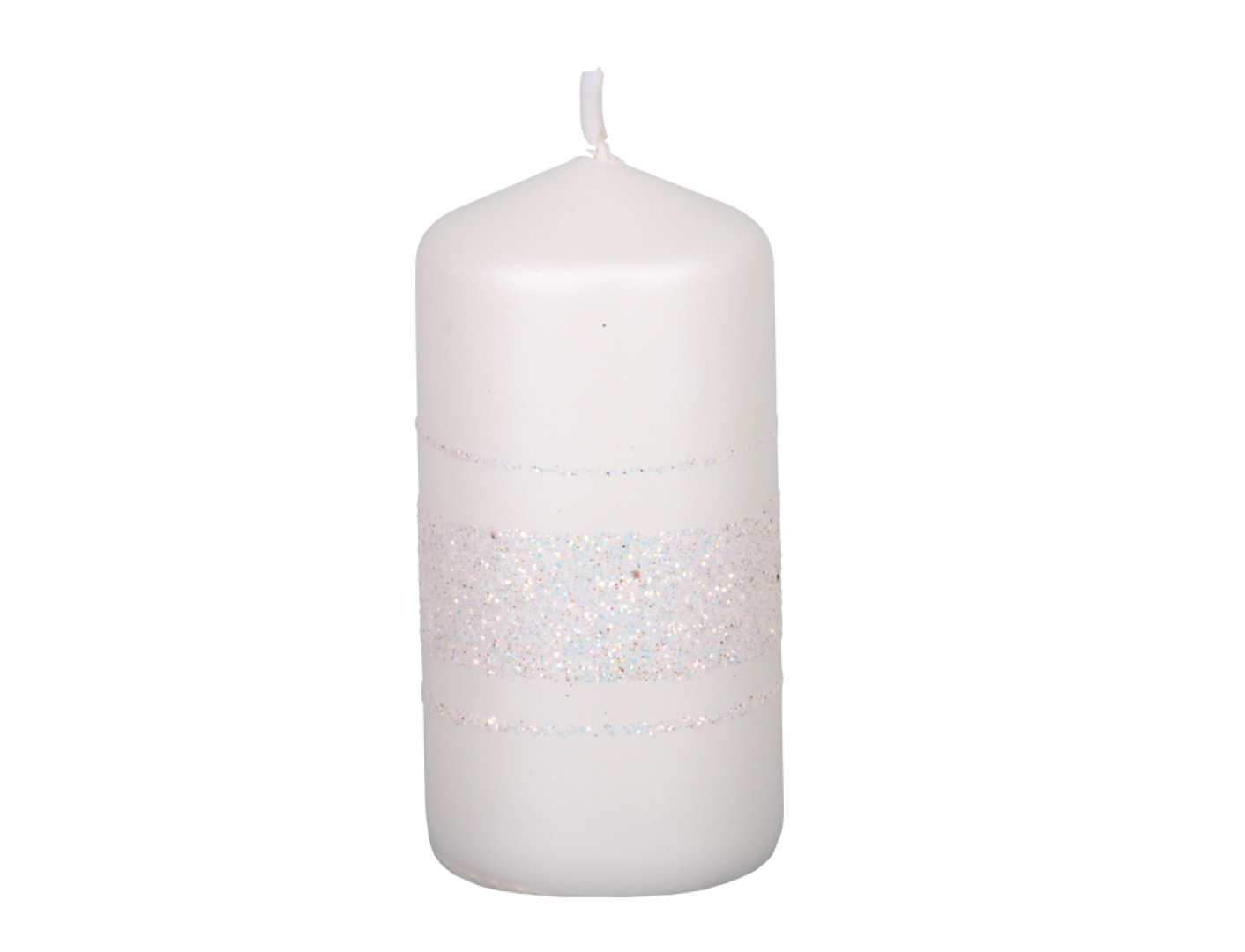 Svíčka ve tvaru válce. Její povrch je hladký v úpravě metalický mat. Navíc je zdobena různě širokými třpytivými proužky. Díky tomu je velmi zdobná a vyjímá se ve vánočních dekoracích. Doba hoření: 38 hodin. Rozměry: průměr 6 cm, výška 12 cm. Barva: bílá. przeczytaj całość
