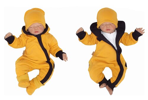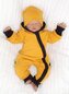 Dětský teplákový overálek s kapucí, čepičkou a botičkami, hořčicový, vel. 86; 86 (12-18m)