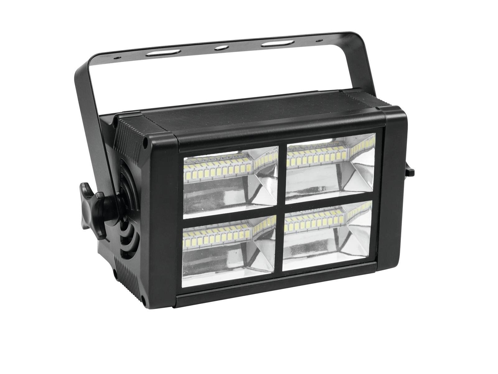 Eurolite LED Mini stroboskop jest podzielony na cztery oddzielne sekcje. Każda sekcja jest wyposażona w 12 x 5030 SMD LED o wydajnych chipach. Sterowanie DMX (3 kanały DMX) lub tryb autonomiczny z Master/Slave. Jasność i szybkość błysków są płynnie regulowane. Możliwość sterowania dźwiękiem za pomocą wbudowanego mikrofonu. Złącze DMX 3-pin XLR. Idealny na domową imprezę, do małego klubu i inne zastosowania.