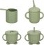 Sada 19ks silikonového nádobí pro děti. Sada obsahuje: misky, talířky, příbor, bryndák, hrníčky s víčkem, krabičku a dudlík. Misky obsahují přísavku. przeczytaj całość