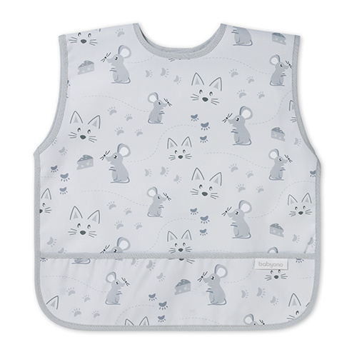 - Fartuszek jest dostępny w dwóch rozmiarach: dla dzieci od 6 miesięcy do 2 lat oraz od 2 lat do 4 lat -chodzących do żłobka i przedszkola.