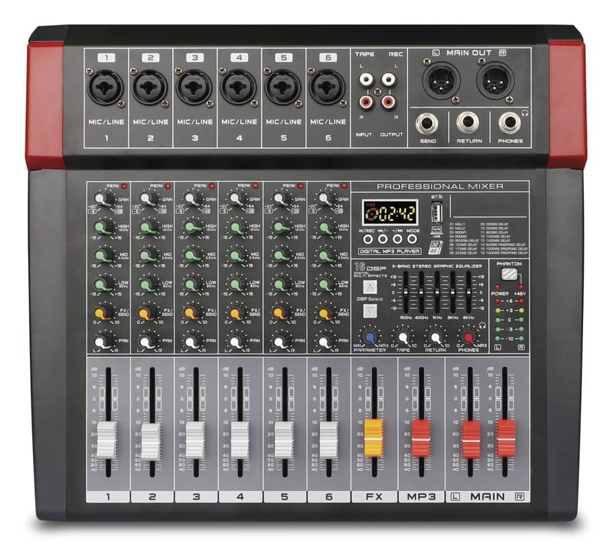 Profesionální mixážní pult, 6 mono vstupů, 1 stereo vstup. Na každém vstupu je 3-pásm. EQ, phantom 48V. Má vestavěný 32bit DSP procesor s 16 volitelnými předvolbami.Zabudovaný USB/MP3 přehrávač s displejem, Bluetooth připojením a funkcí nahrávání. K USB vstupu lze připojit i PC. Výstupní 5pásmový... przeczytaj całość