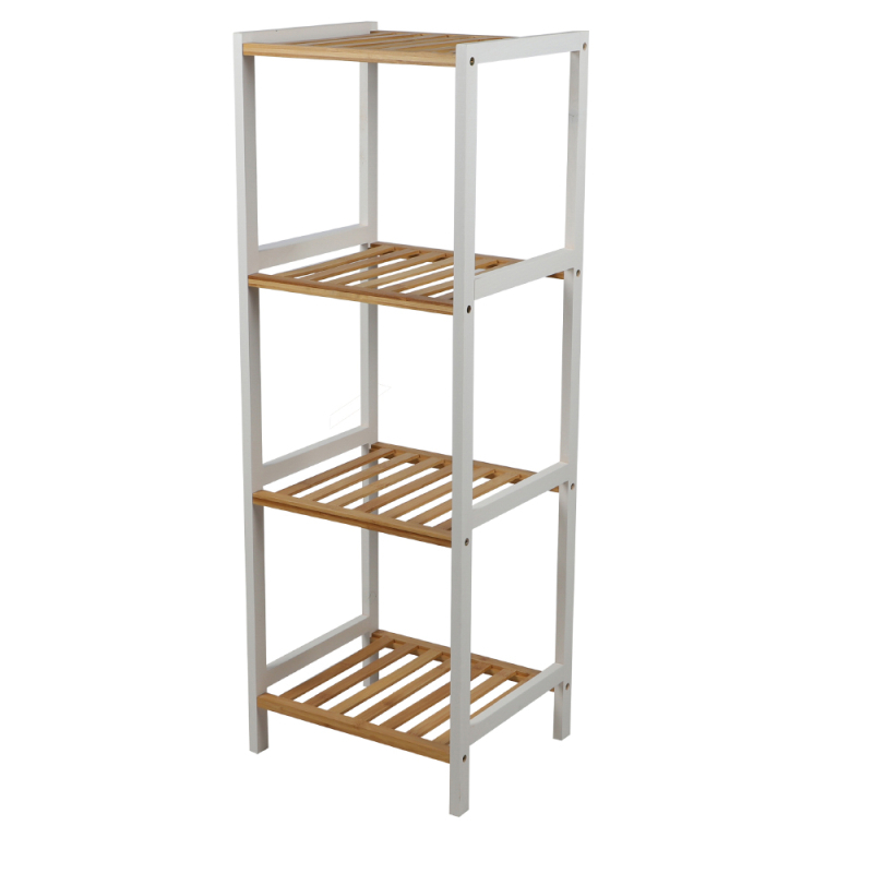 Police, regál se 4mi policemi, stojací regál z bambusu, kombinace bílé a dřeva, rozměry: 35x30x100cm, vhodný do obývacího pokoje, koupelny, kuchyně či předsíně. przeczytaj całość