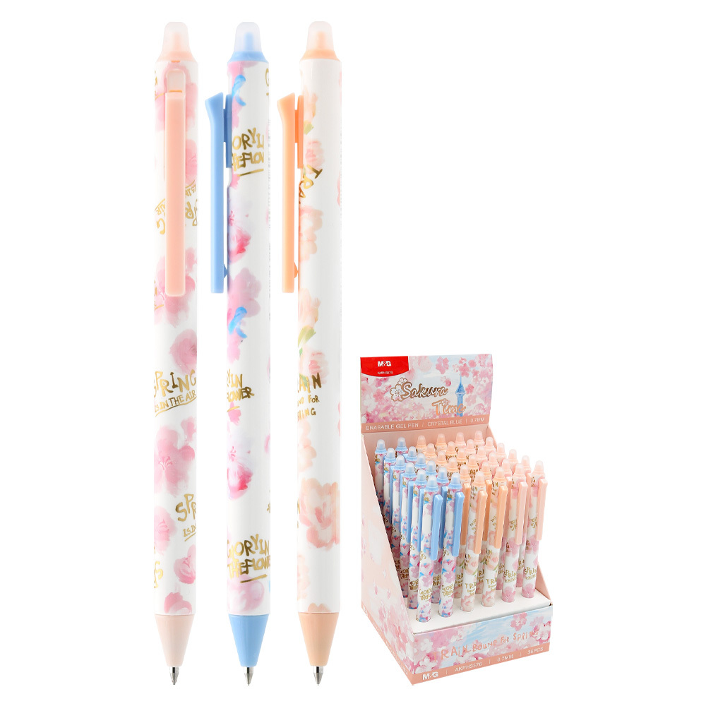 Gumovací gelové pero v motivu rozkvetlé sakury (3 designy v balení).stopa (hrot) 0,7 mmmodrý gumovací inkoustguma na horní části perastisknutím spony se vysune / zasune tuhavelkoobjemová náplň pro dlouhé psanínáhradní náplň: 53004 | 53004B | 53004CBalení obsahuje 36 ks per.Cena je za 1 kus. przeczytaj całość