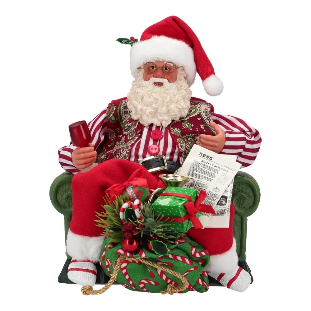 Detailně propracovaná figurka Santu s kalichem a dárky sedícího v křesle s rolničkou.materiál: polyester, polyresin, plast przeczytaj całość