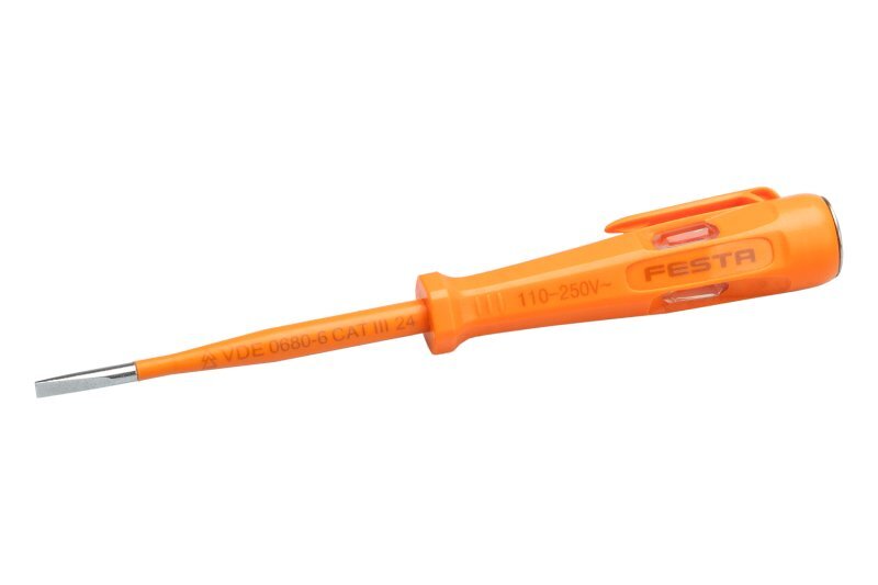 Próbnik napięcia fazowy FESTA został zaprojektowany do niezawodnego sprawdzania napięcia przemiennego w zakresie 110 - 250 V. Dzięki neonówce (doutnavce) łatwo rozpoznasz, kiedy przewód jest pod napięciem, co znacznie ułatwia i przyspiesza diagnostykę obwodów elektrycznych. W zestawie znajduje się płaski śrubokręt o szerokości 3 mm i długości 145 mm, który jest praktycznym dodatkiem przy drobnych naprawach i modyfikacjach instalacji elektrycznej.