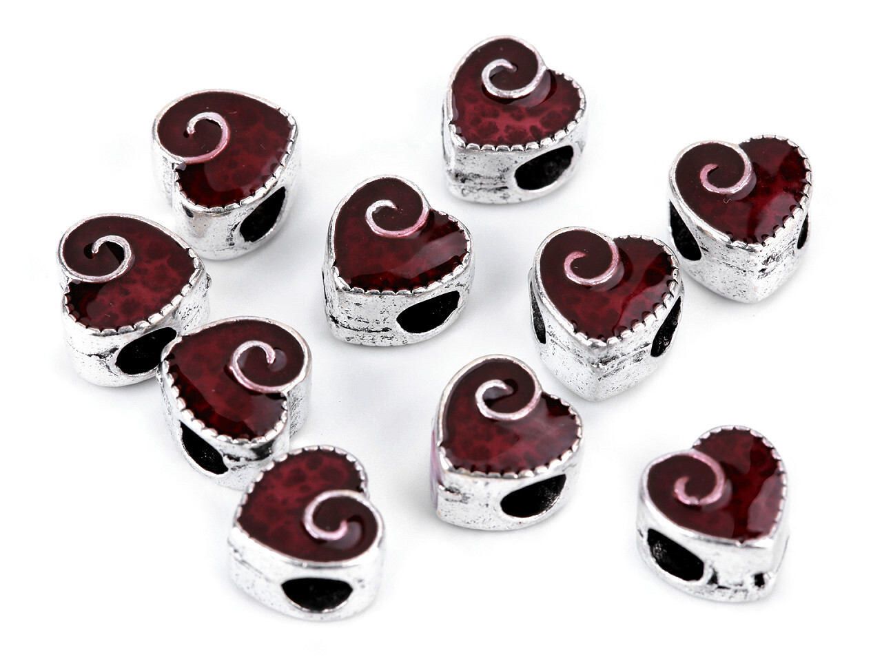 Kovové korálky s velkým průvlekem srdce 10x10 mm - 20 ks - 1 červená tmavá