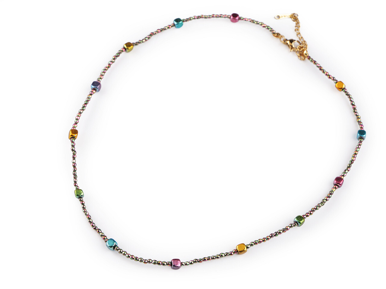 Poutavý náhrdelník vyrobený z korálků pokoveného hematitu a kvalitní nerezové oceli je velice elegantní, patří mezi šperky, které díky své fascinující povrchové úpravě zaujmou na první pohled.
