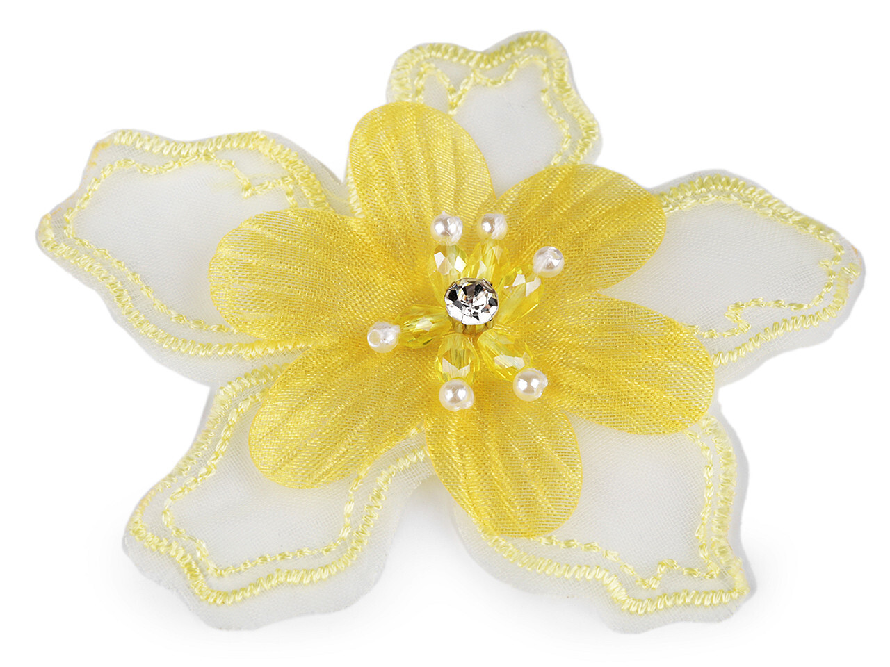 Zdobný květ je složený ze 2 vrstev: spodní část květu je monofilová se zesílenými vyšívanými okraji a působí velmi romanticky. Druhou vrstvu tvoří jednoduchý květ z organzy. Střed květu zdobí našité broušené korálky, perličky a broušený kamínek.