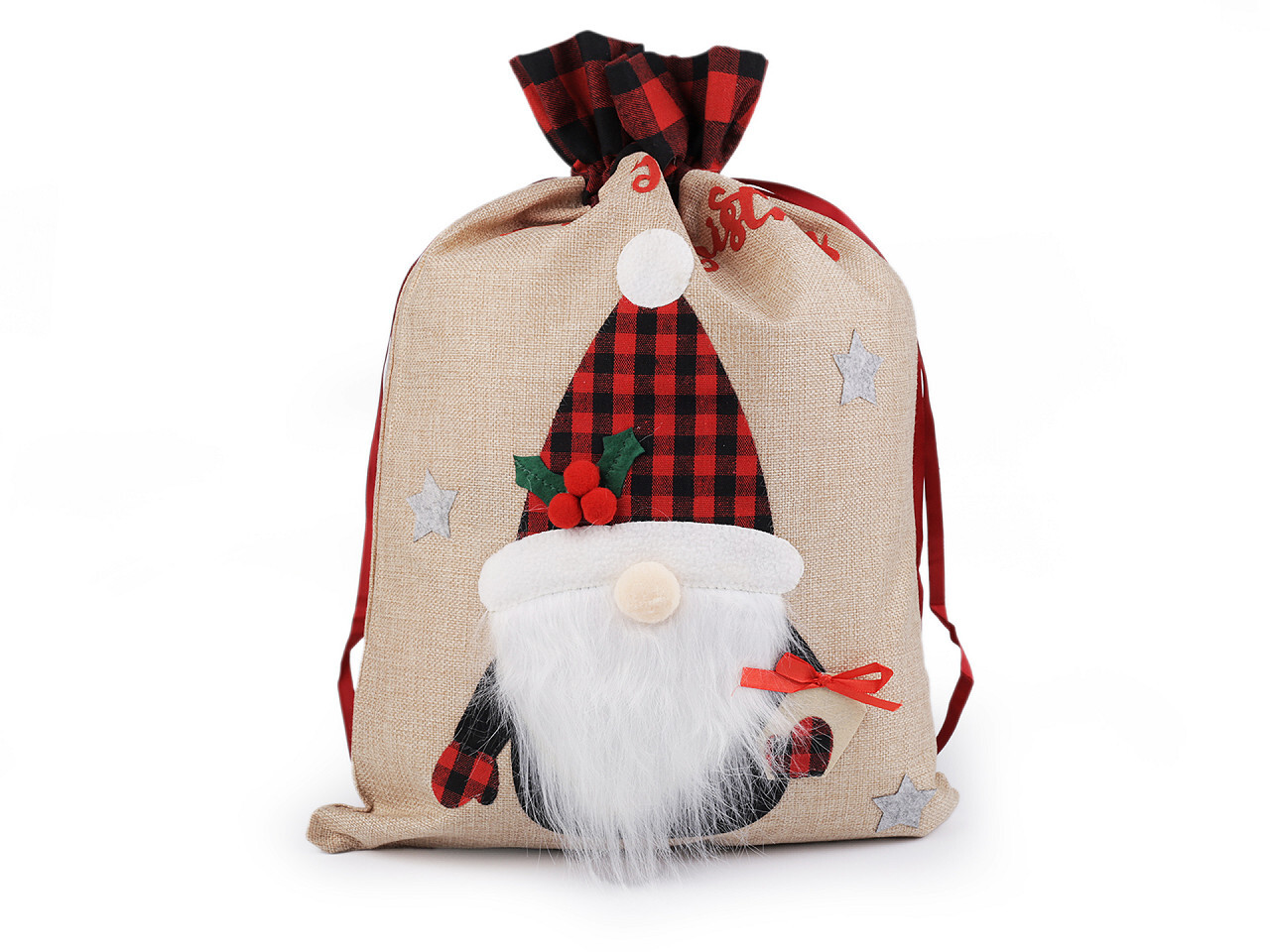 Worek świąteczny zdobędzie serca wszystkich dzieci. Wykonany jest z imitacji juty, na przedniej stronie zdobi go aplikacja postaci z wieloma interesującymi detalami. U góry ozdobiony jest kraciastym obszyciem. Nadaje się nie tylko do pakowania prezentów, lecz także jako efektowna dekoracja na Boże Narodzenie. Wygodnie zamyka się za pomocą satynowych sznurków ściągających.