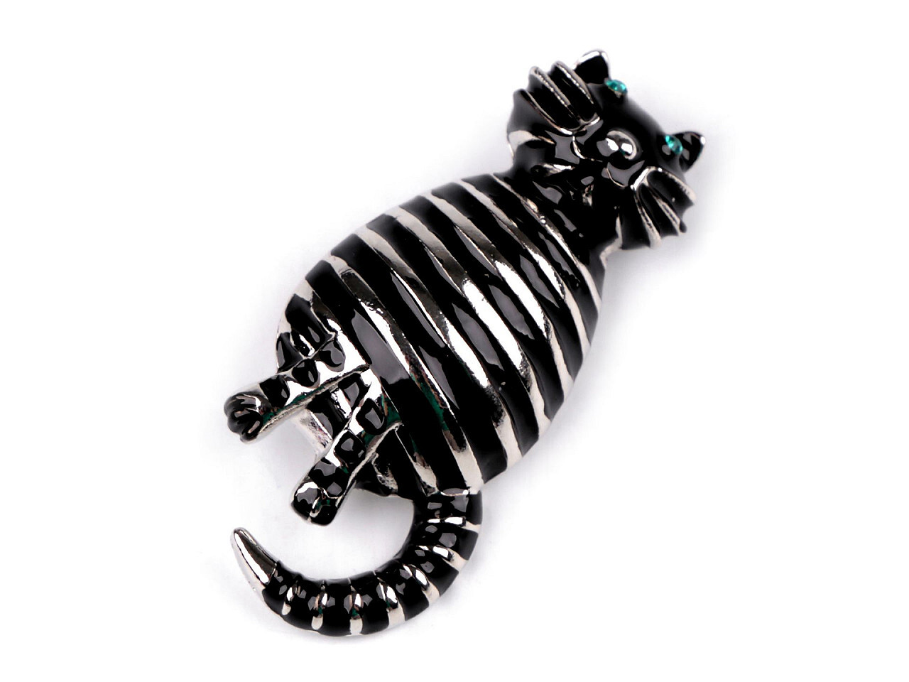 Brož kočky se smaltovanými pruhy je zajímavým módním doplňkem, který využijete na běžné nošení. Oči má ozdobené broušenými kamínky. Z rubu má brož zavírací špendlík. Můžete ji nosit nejen na oděvech, hodí se i k ozdobení klobouků, tašky či sepnutí šátku. Zadní stranu má dutou - odlehčenou.