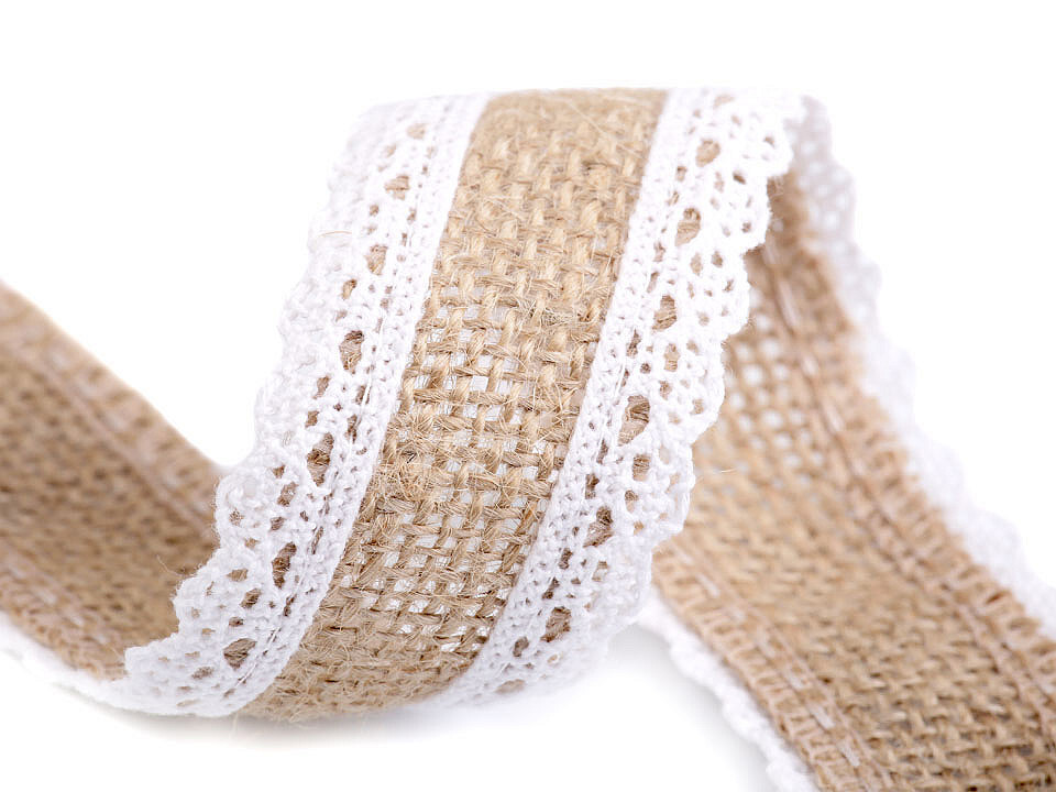 Jutová stuha s bavlněnou krajkou šíře 38 mm - 1 ks - 1 bílá
