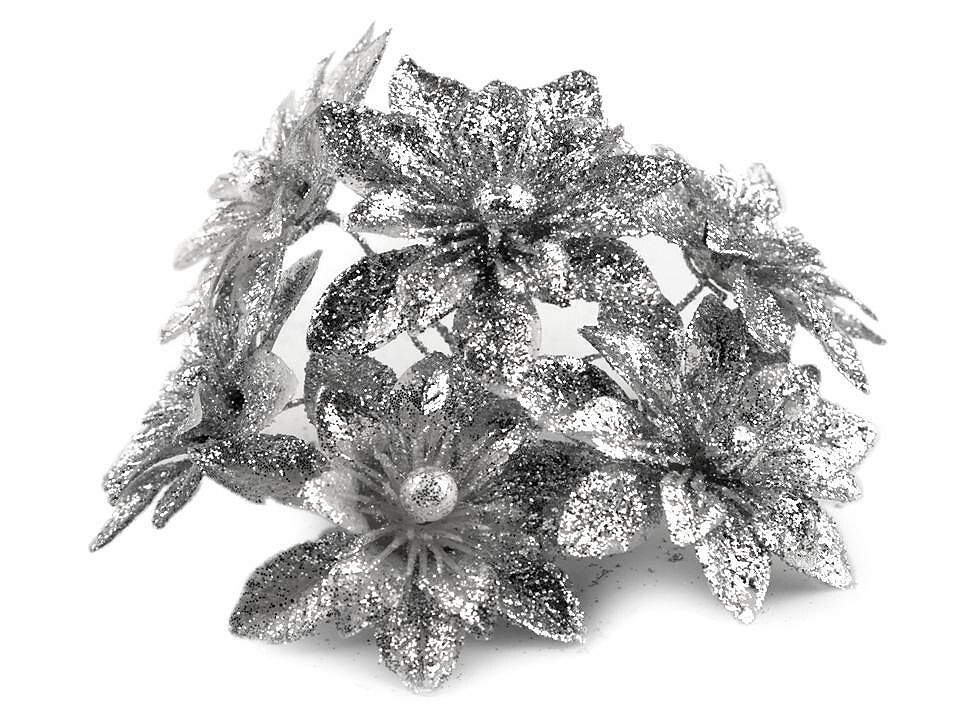 Vánoční květ na drátku s glitry - 72 ks - 2 stříbrná