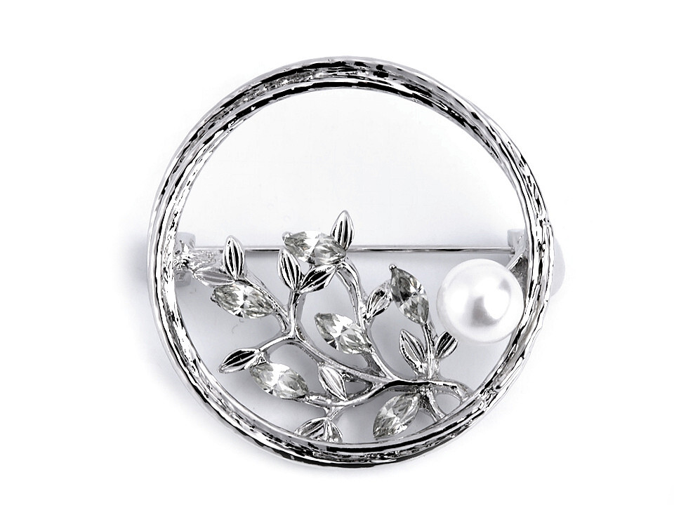 Kulatá brož s perlou a broušenými kamínky je velice elegantní. Vnitřní motiv znázorňuje květy. Bude se skvěle vyjímat na šatech, v klopě saka či na elegantním kloboučku nebo kabelce. Můžete ji použít na sepnutí šátku. Hodí se ke slavnostním událostem i na běžné nošení.